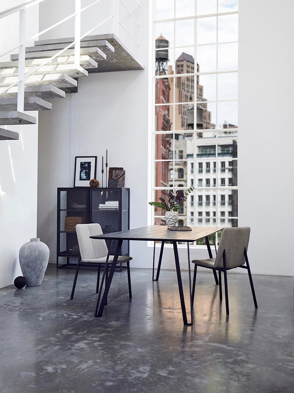 Bequemer Stuhl für Esstische in coolem, nordischen Design. Die Sitzfläche und Rückenlehne sind mit einem sehr strapazierfähigen und abwaschbaren Textilstoff aus Polyester gefertigt. Die Beine sind aus schwarz pulverisiertem Eisen.