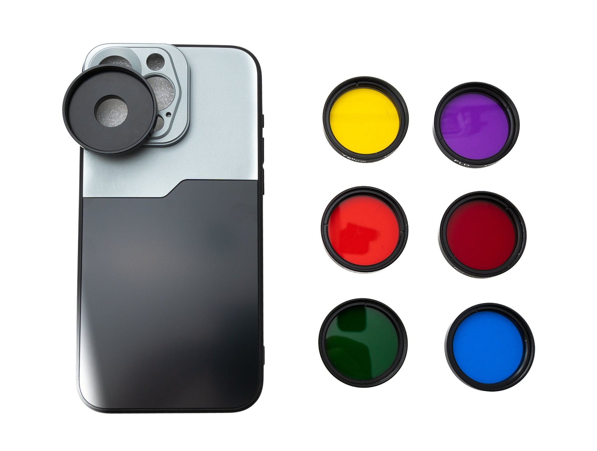 Lieferumfang: Hartschale mit Gewinde, Aufsatz und Linsen (Blau, Rot, Orange, Gelb, Grün, Lila) - ausschließlich geeignet für iPhone 15 Pro Max