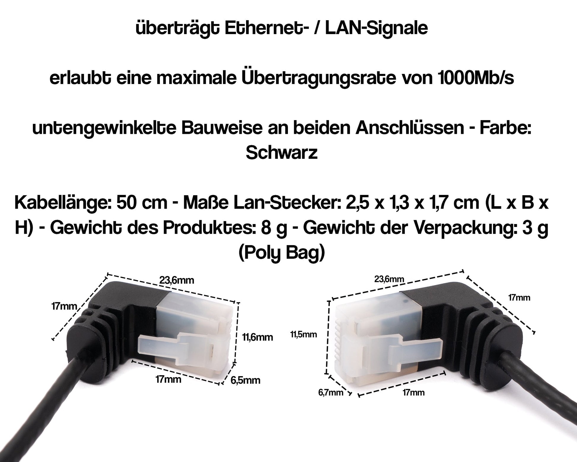 Kabellänge: 25 cm - Maße Lan-Stecker: 2,5 x 1,3 x 1,7 cm (L x B x H) - Gewicht des Produktes: 8 g - Gewicht der Verpackung: 3 g (Poly Bag)