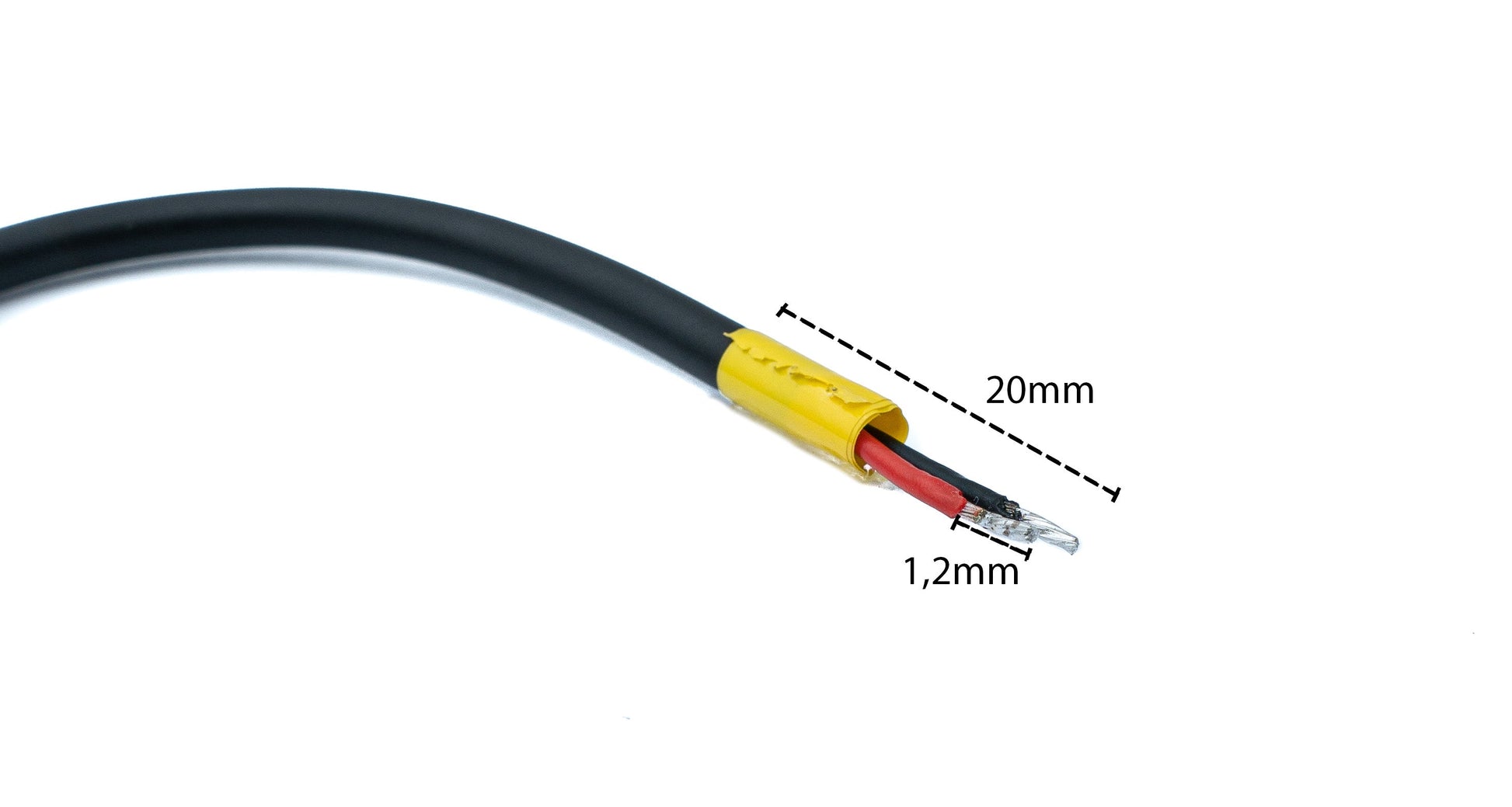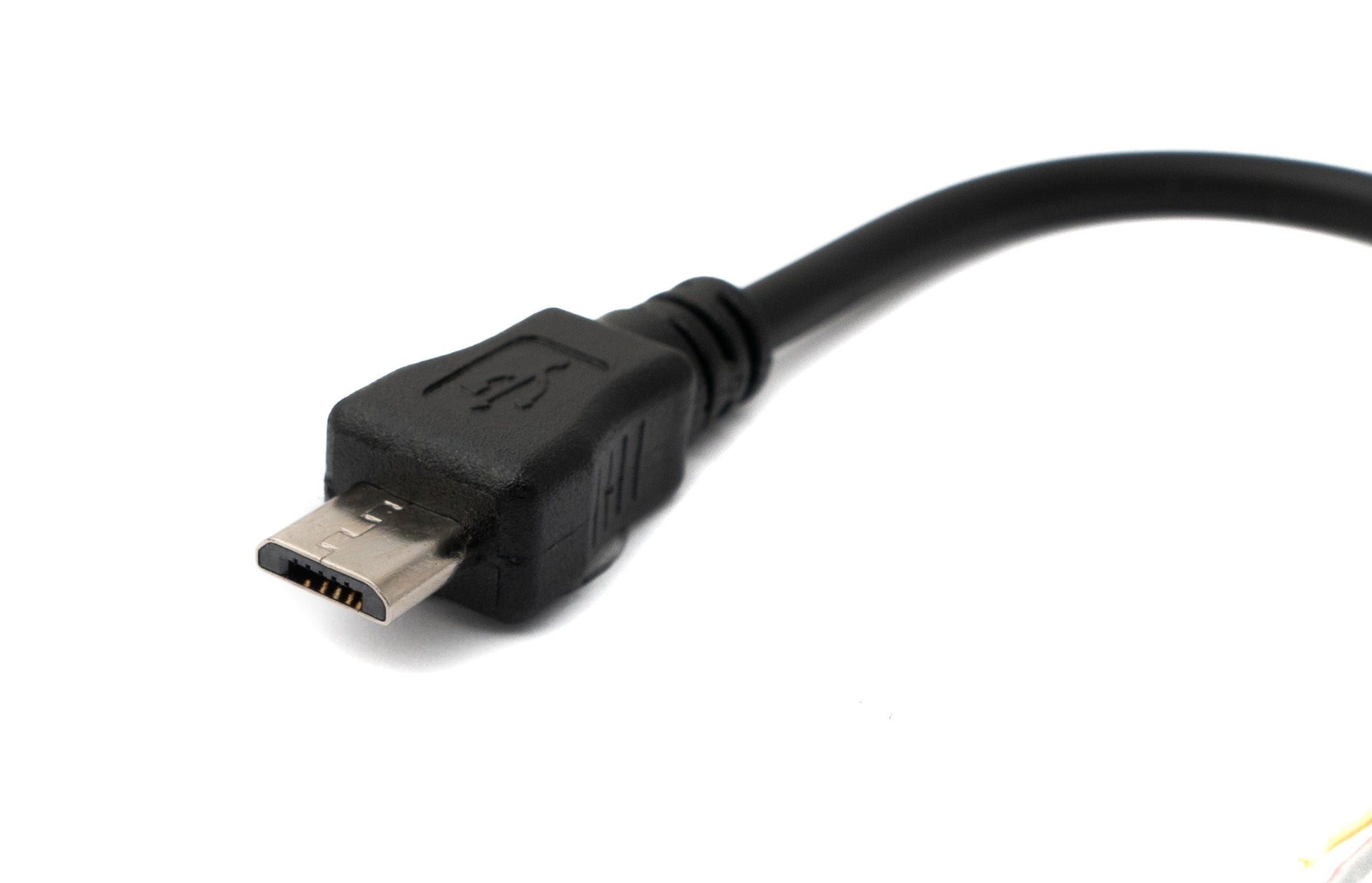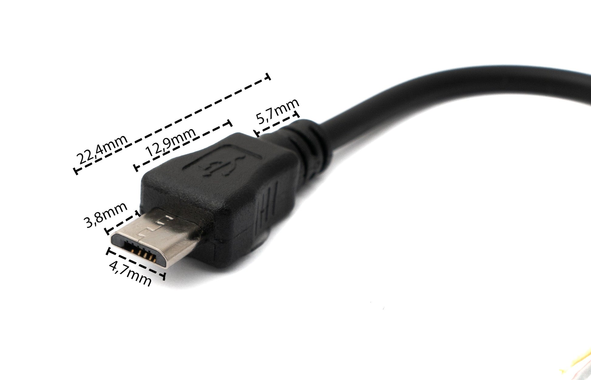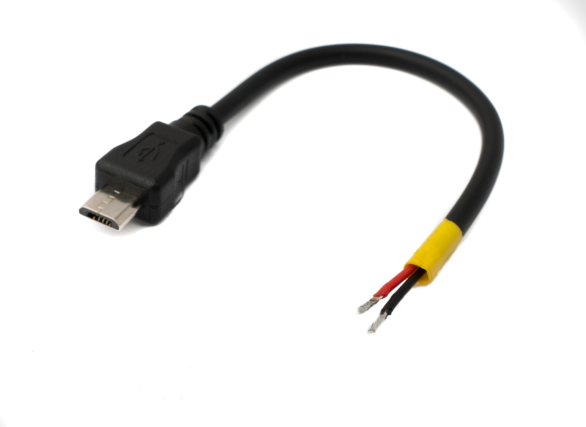 Anschlüsse: Das Kabel verfügt über einen USB 2.0 Micro-B Stecker auf der einen Seite und zwei offene Kabelenden auf der anderen Seite, die für VCC (5 V) und GND (Masse) stehen. Der rote Draht ist für VCC (5 V) (pin 1 des Micro-USB-Anschlusses) und der schwarze Draht ist für GND (Masse) (pin 5 des Micro-USB-Anschlusses).
