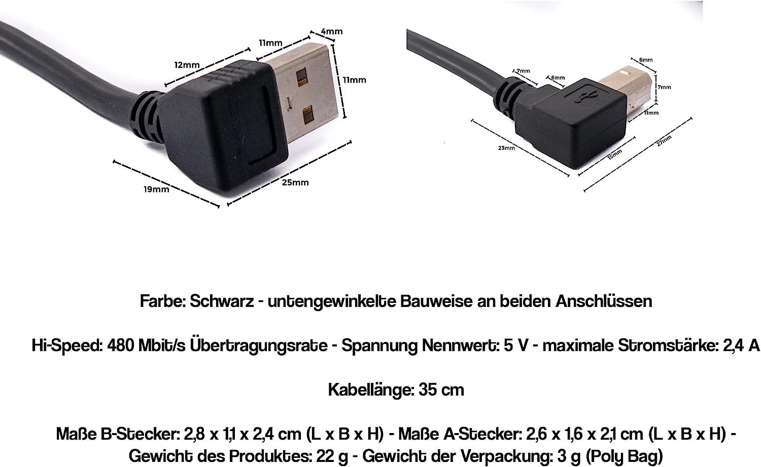 - 1x SYSTEM-S USB 2.0 Kabel 35 cm Typ B Stecker zu Typ A Stecker Adapter Winkel in Schwarz