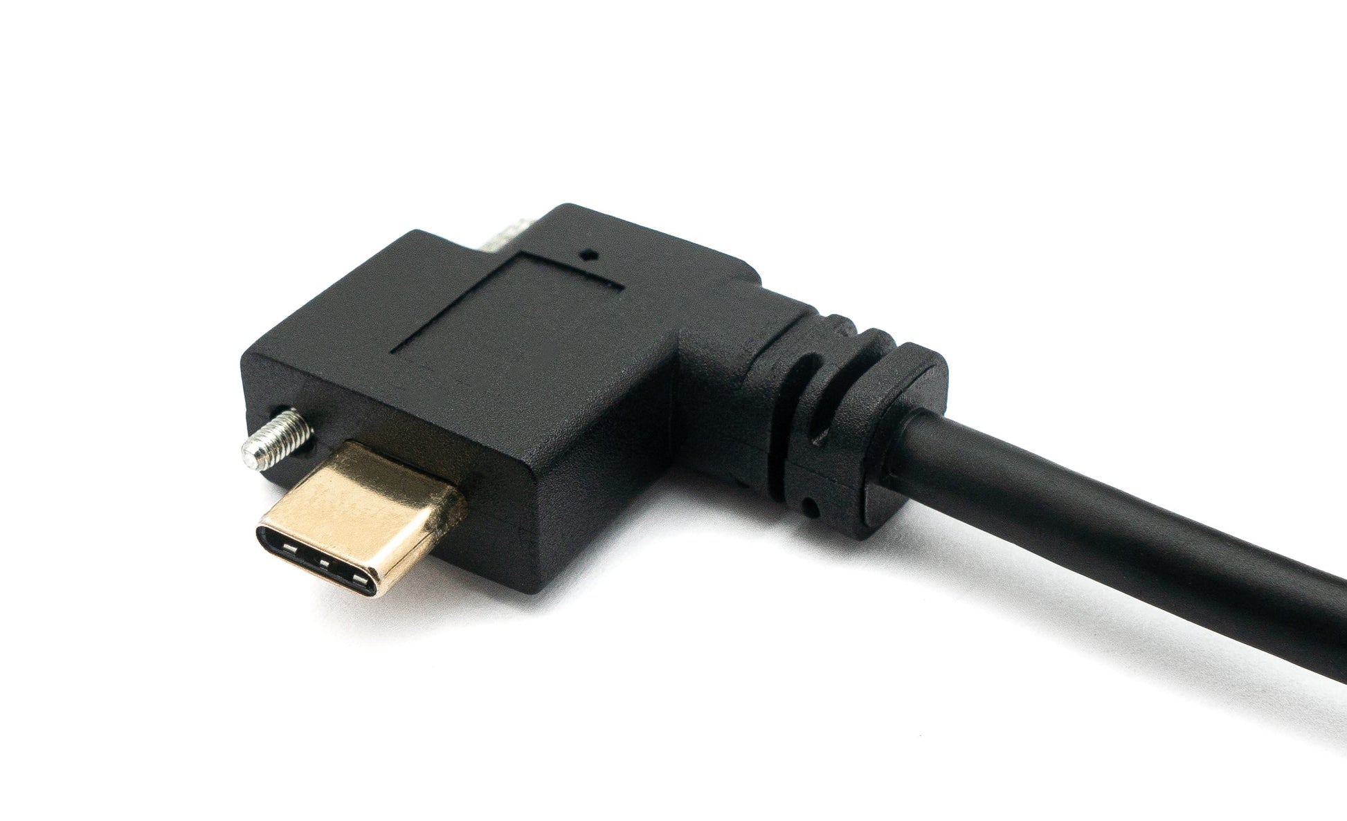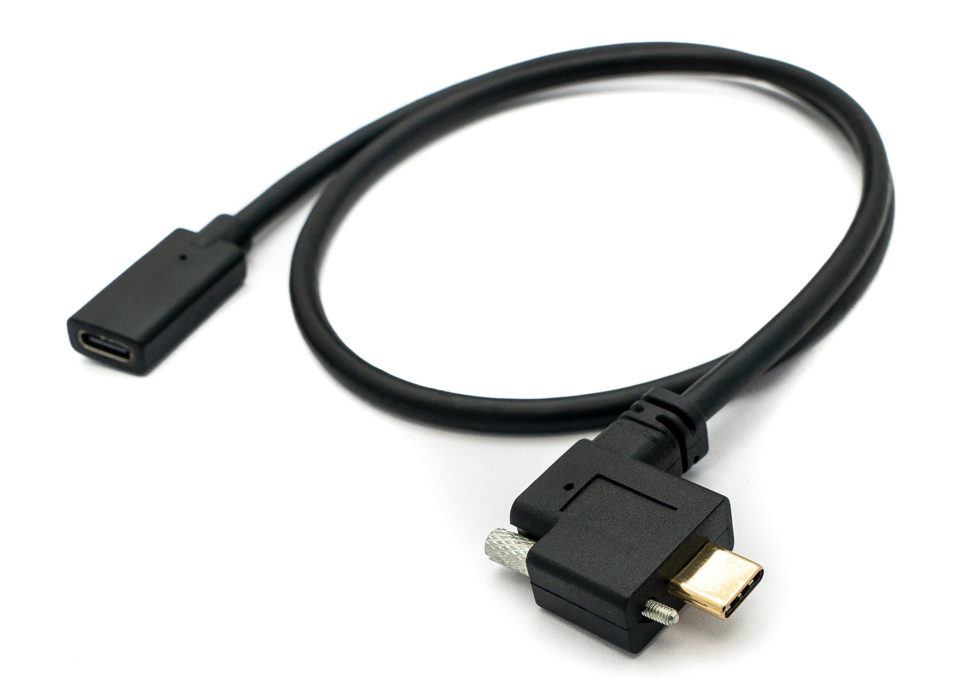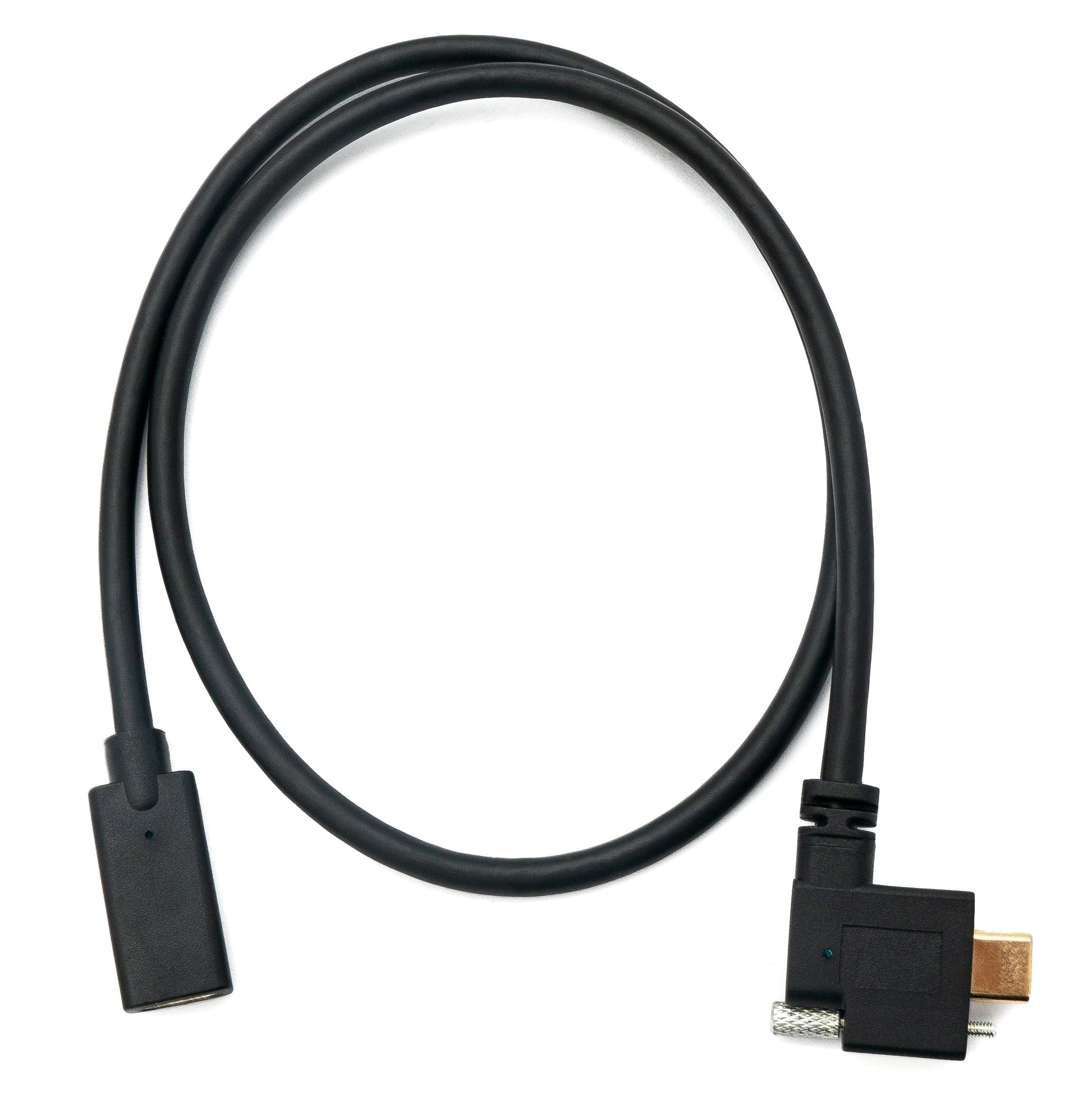 Anschlüsse und Befestigung: Das Kabel verfügt über einen gewinkelten (Right-/Left-Angled) Typ C Stecker und eine Typ C Buchse, beide mit Panel-Mount-Fähigkeit für eine sichere Befestigung.