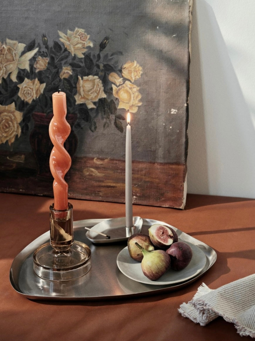 Organisch geformtes Serviertablett der Serie Mie aus Eisen mit silber finish. Nutze das Tablett zum Dekorieren von Kerzen, kleinen Vasen oder als Unterlage für Dipschälchen.