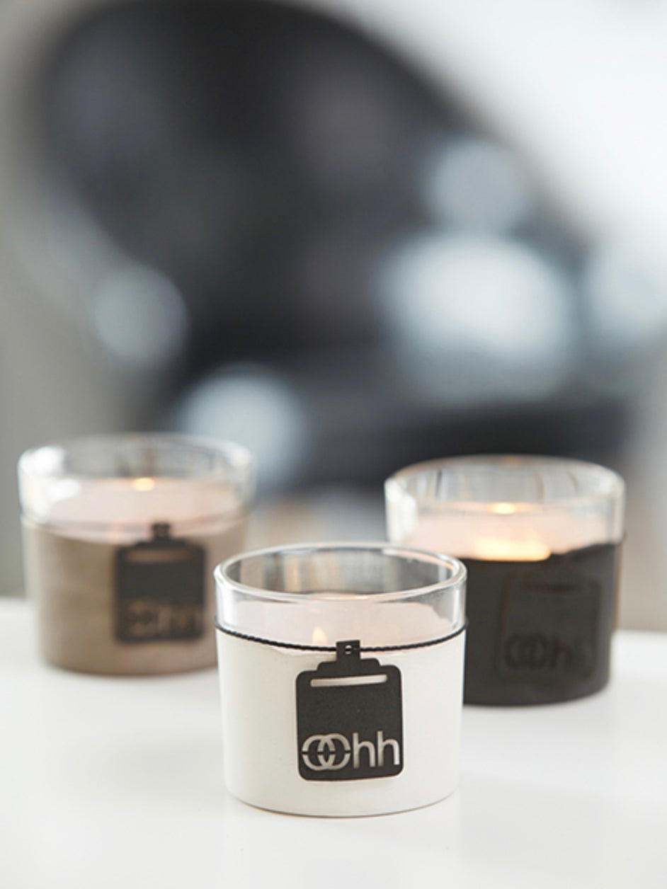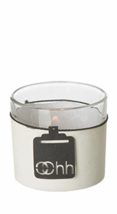 Schlichter Teelichthalter aus recyceltem Glas. Innen weiß durchscheinend, außen mit Zementfarbe und schwarzem Gummiband verziert.