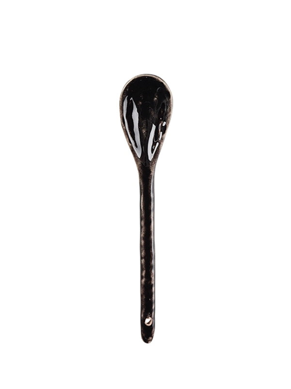 Teelöffel der Serie Nordic Coal aus Steingut. Jedes Teil fällt in Farbe und Struktur etwas unterschiedlich aus. Unebenheiten unter der Lasur sind gewollt und Bestandteil des nordischen Designs. Weitere Teile der Serie werden ebenfalls angeboten.