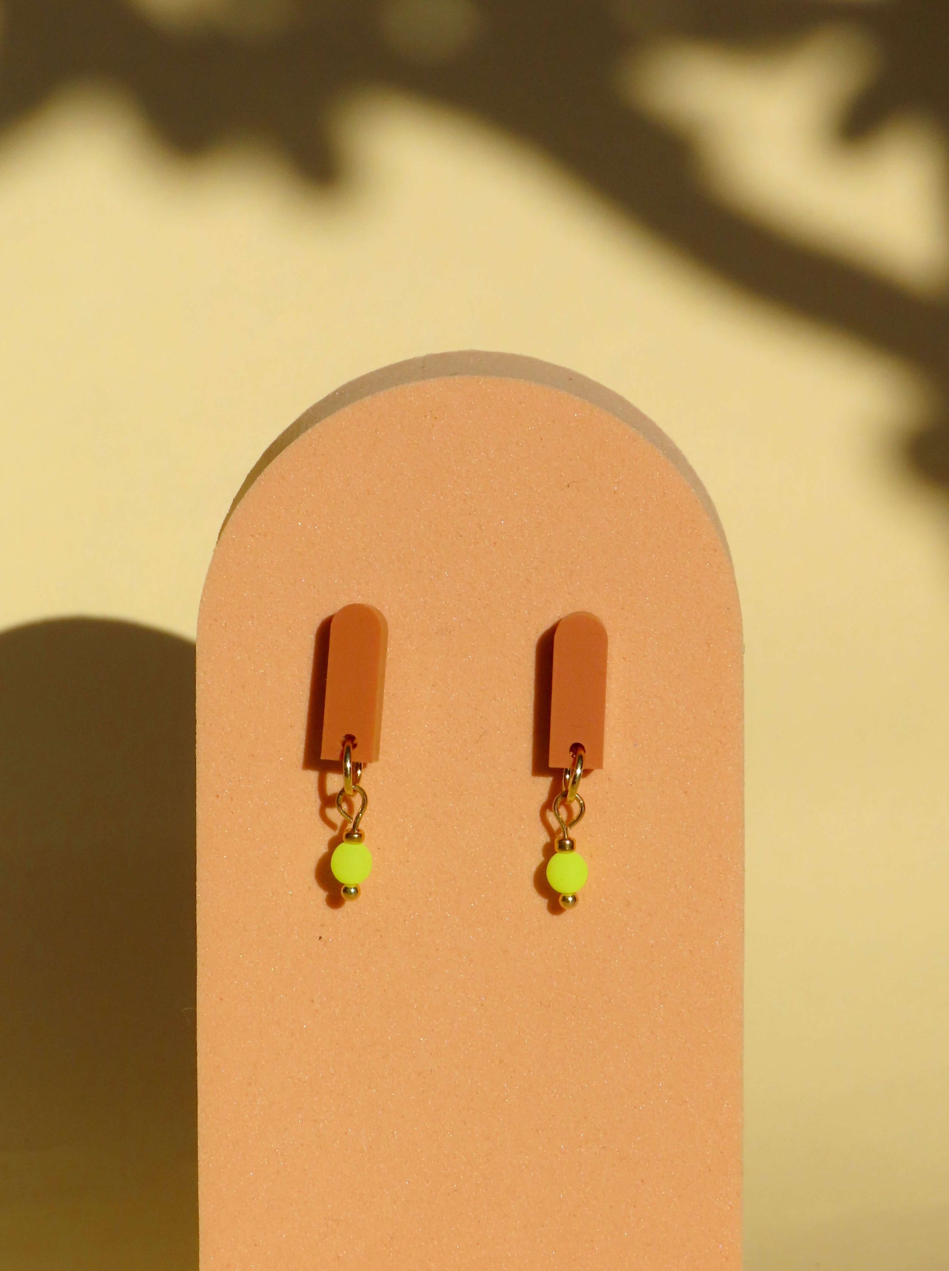 Ein länglicher Stecker aus mattem Terracotta-Acryl kombiniert mit einem leuchtenden Neon-Gelben Perlenanhänger – ein feiner Kontrast, der sofort ins Auge fällt.