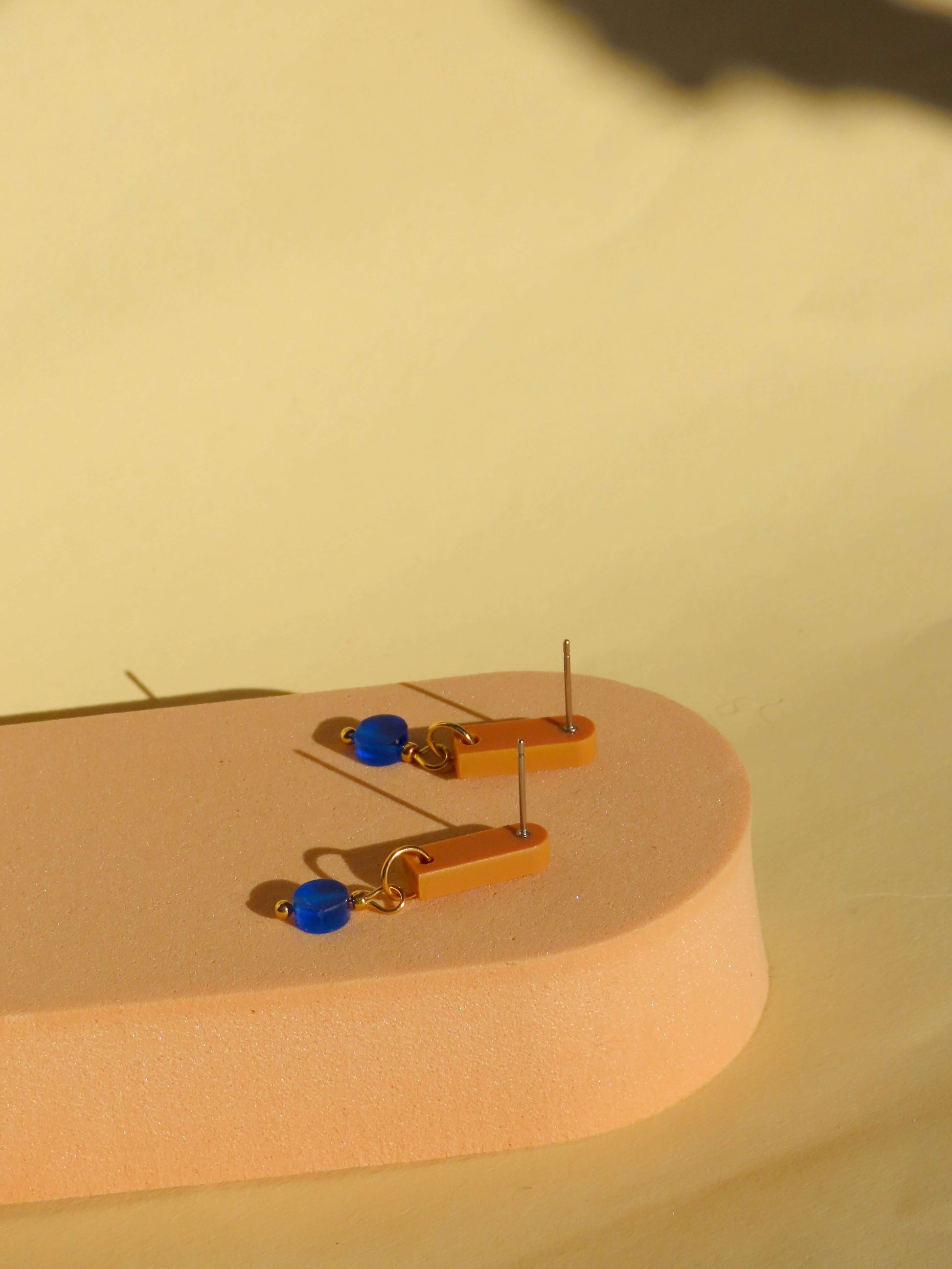 Die Paula Ohrringe spielen mit einem klaren, minimalistischen Design: Oben ein länglicher Stecker in warmem Terracotta, der durch seine matte Oberfläche Ruhe und Erdung ausstrahlt. Daran schwingt ein kleiner, runder Anhänger in intensivem Königsblau – fast leuchtend wie ein Tropfen aus Glas.