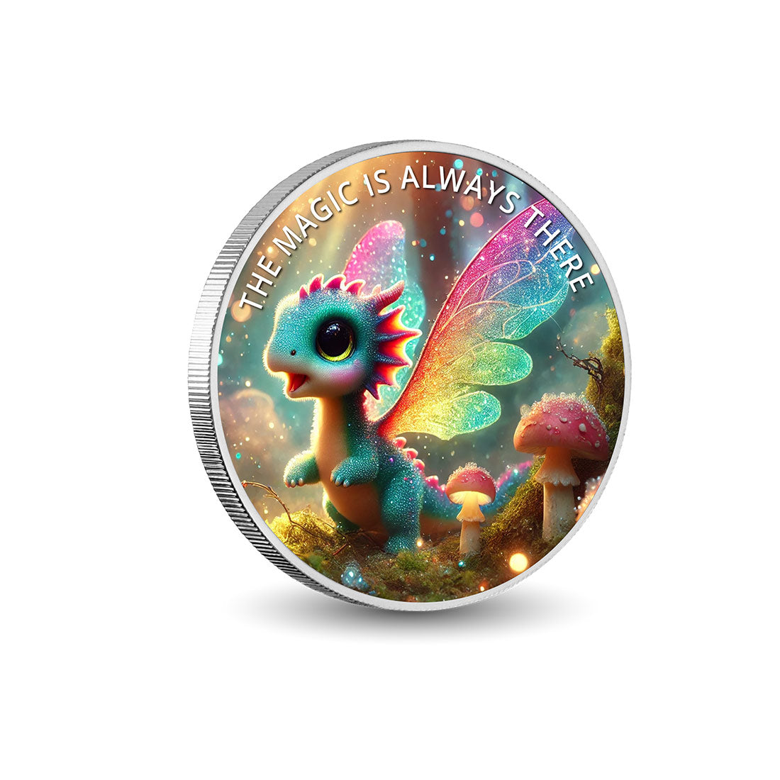 This radiant coin features a cute baby dragon adorned with iridescent wings, along with swirling colours and shimmering sparkles that create a joyous atmosphere. Surrounded by colourful mushrooms and a softly glowing backdrop, it's not just a coin; it's a piece of art that invites you to embrace your imagination.
