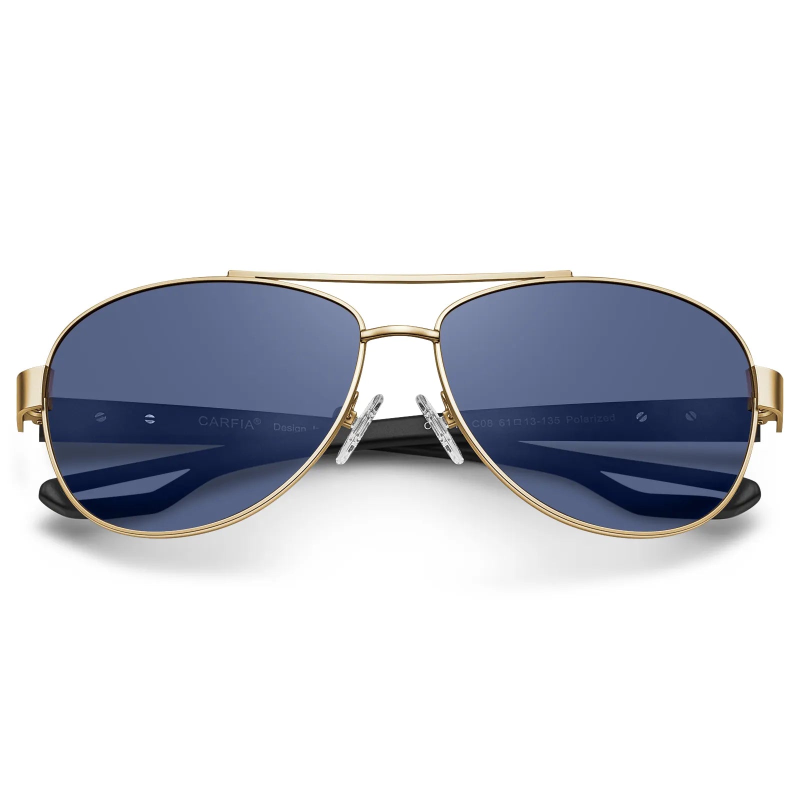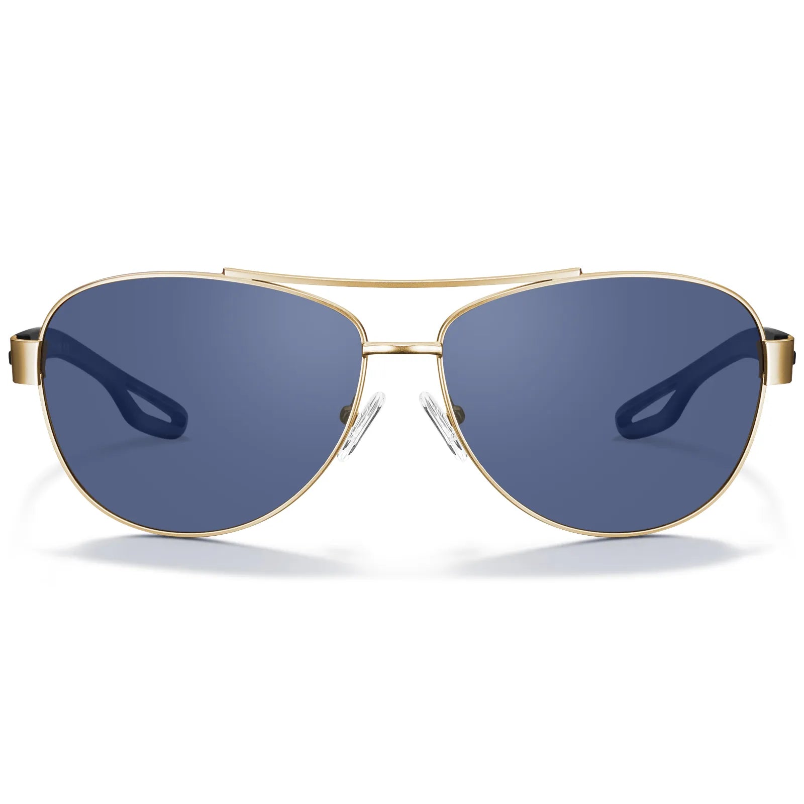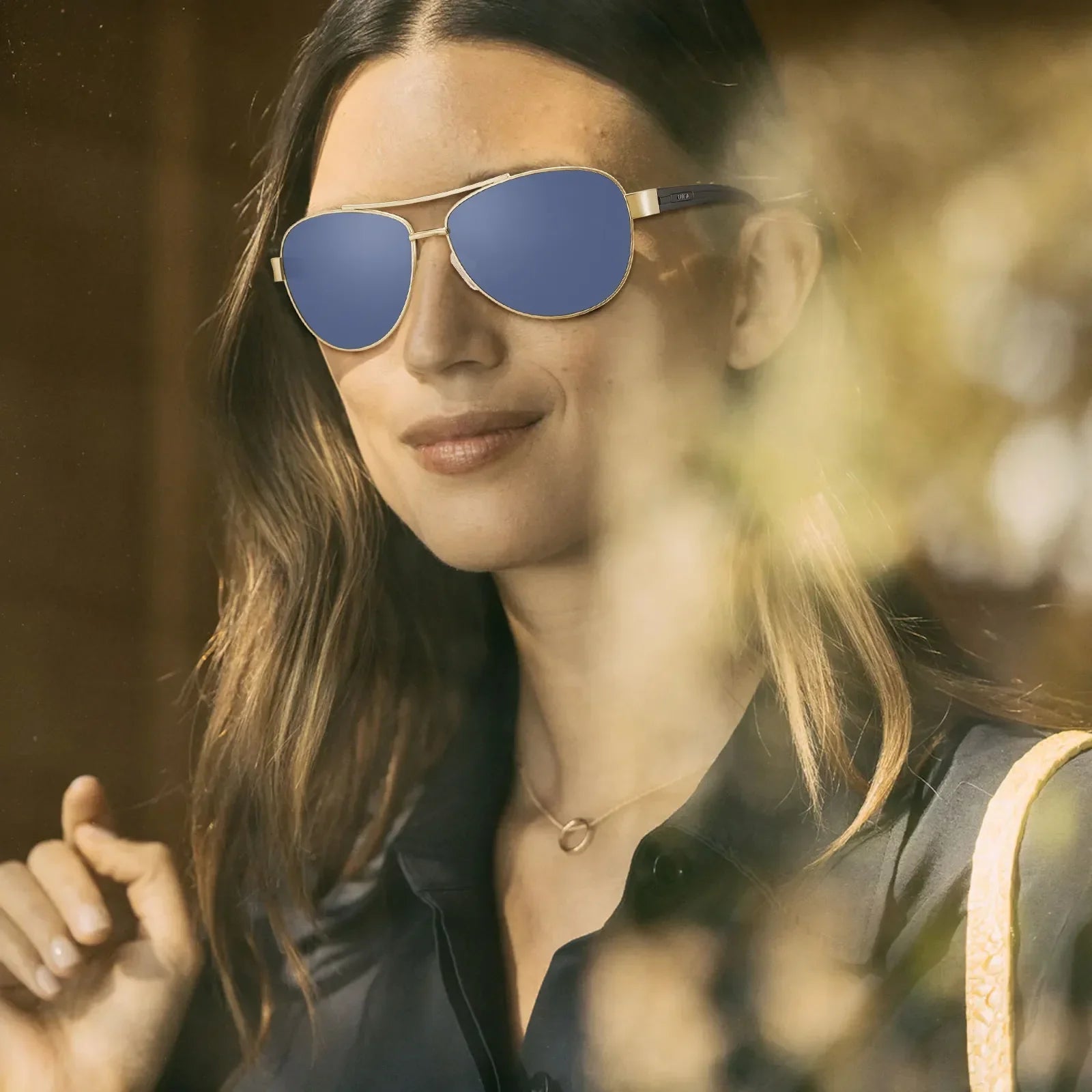 This new interpretation of classic aviator sunglasses combines modern and retro design elements. Calm takes the iconic pilot look to a new level of coolness. The full-rim gold finish and black acetate temples perfectly match, these aviator sunglasses show an active lifestyle!