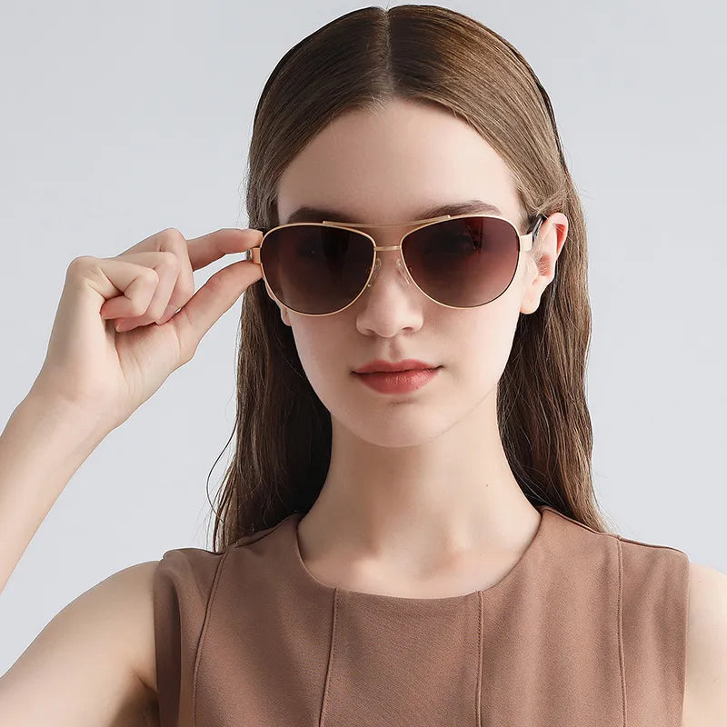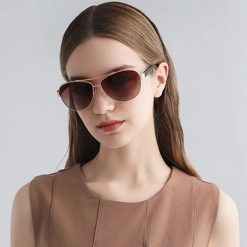 This new interpretation of classic aviator sunglasses combines modern and retro design elements. Calm takes the iconic pilot look to a new level of coolness. The full-rim gold finish and black acetate temples perfectly match, these aviator sunglasses show an active lifestyle!