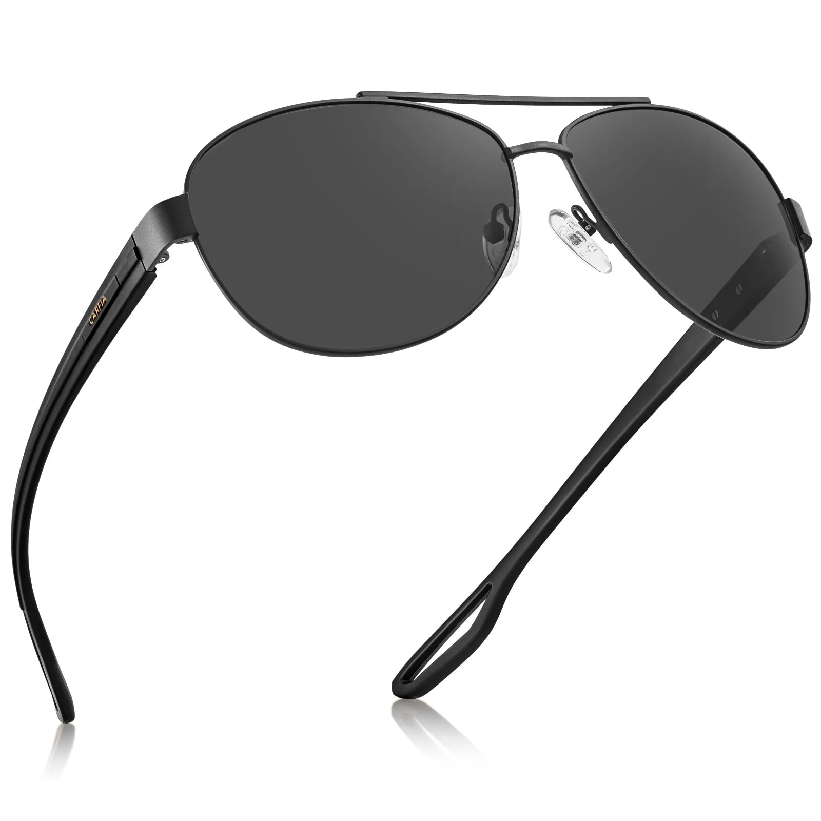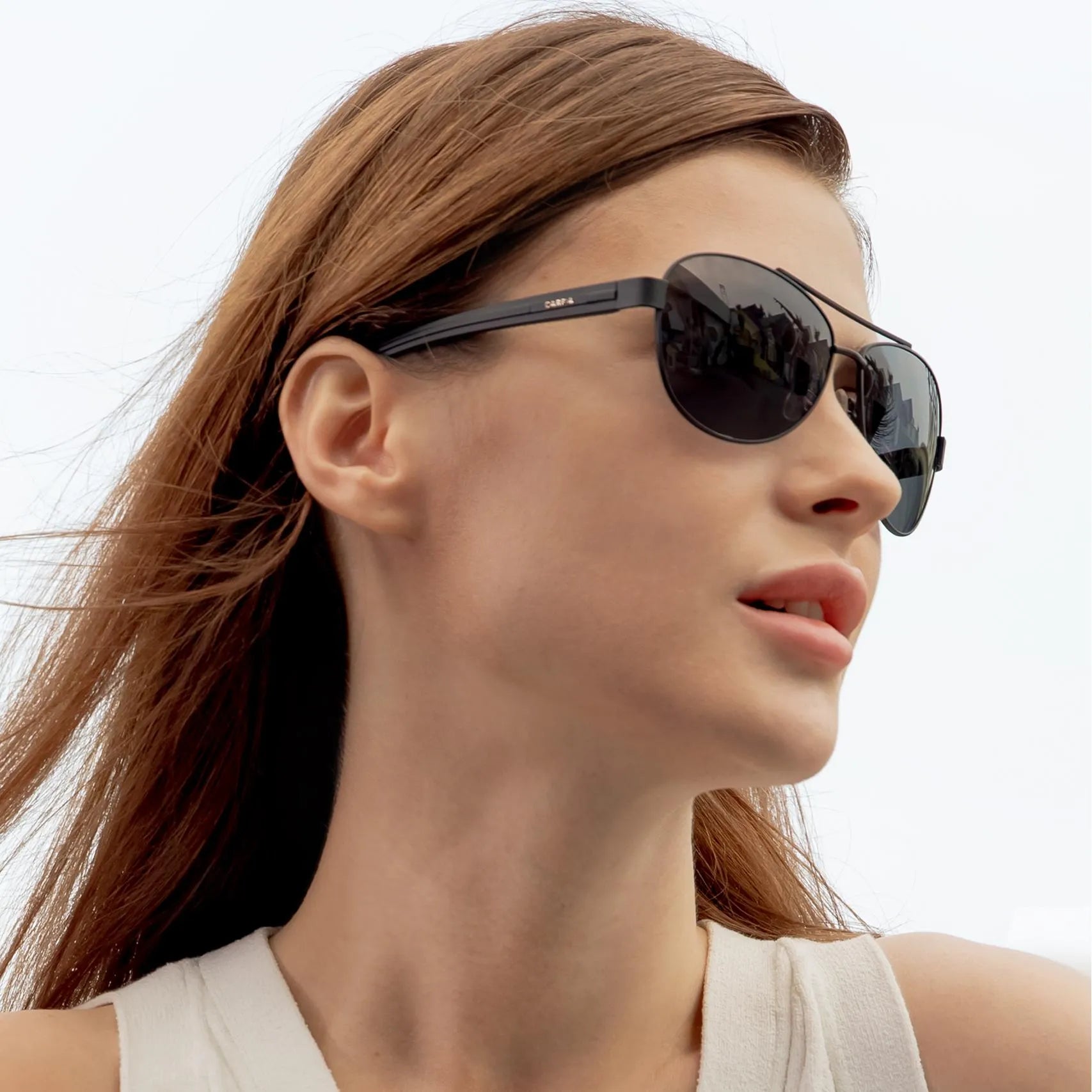 This new interpretation of classic aviator sunglasses combines modern and retro design elements. Calm takes the iconic pilot look to a new level of coolness. The full-rim gold finish and black acetate temples perfectly match, these aviator sunglasses show an active lifestyle!
