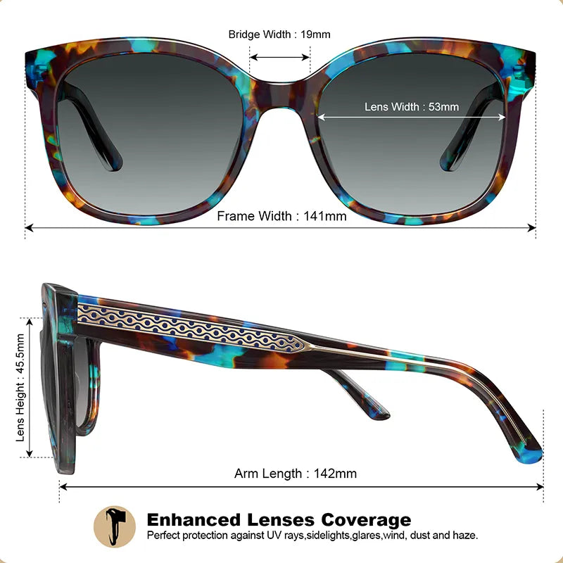 - Comfortable Women's Sunglasses - Revel in unrivaled comfort with our seamless nose pad shades. Bid farewell to hair tangles and pinches! Our women's polarized sunglasses feature high-quality acetate frames, reinforced three-barrel metal hinges, and a hand-inlaid embossed pattern metal wire core, which augments the overall durability of the frame. Come and experience daily delight with these comfortable and stable square sunglasses!