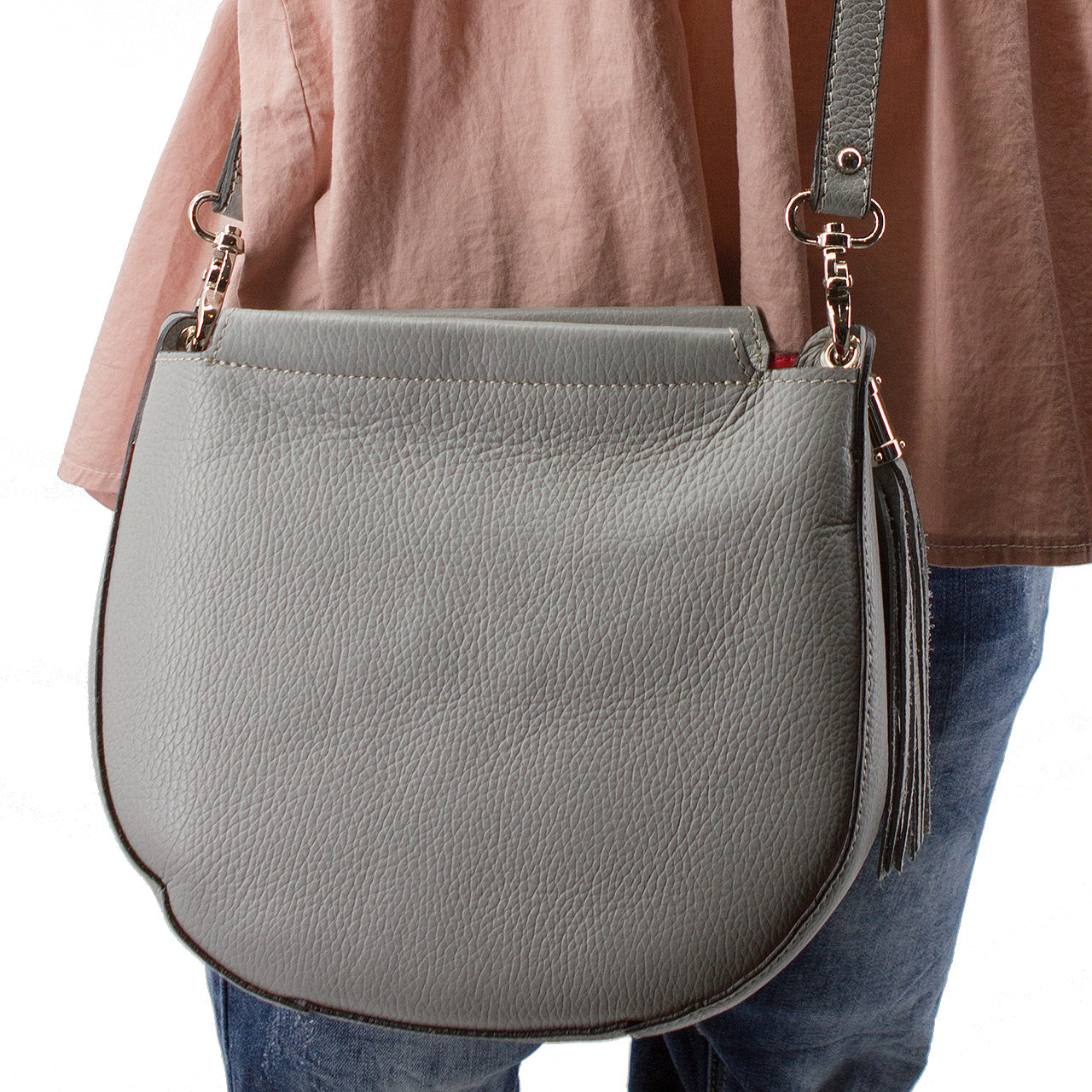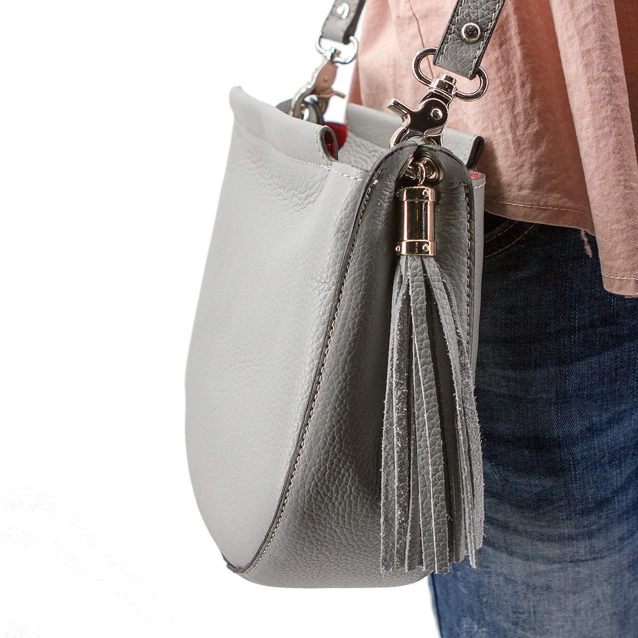 Modische Leder Tasche in D Form mit Quaste. Optional mit Blüten / Blumen Ledertragegurt - Siehe dazu die Bundle Angebote - Ein Großes Innenfach und eine seitliche Innentasche mit Reißverschluss, Tragegurt, Breite ca. 25 cm und Höhe ca. 23cm Tiefe ca. 9cm, Innenfutter 100% Polyester,
