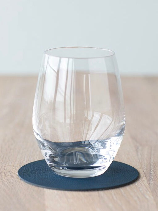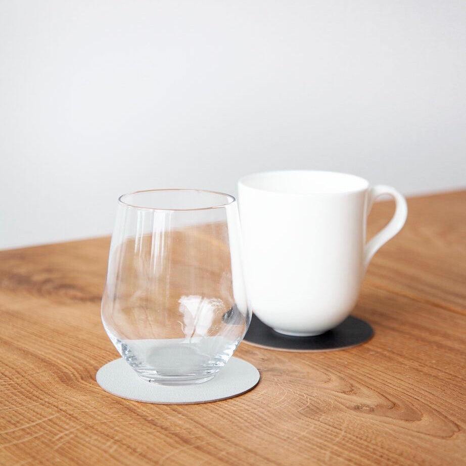 Glasuntersetzer aus recyceltem Leder und Naturkautschuk. Die Oberfläche ist leicht mit einem feuchten Tuch zu reinigen. Klassische runde Form.