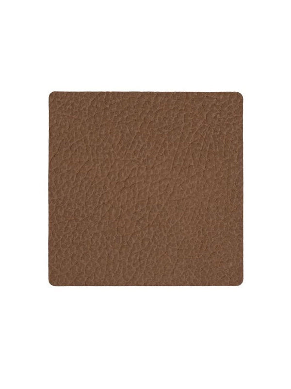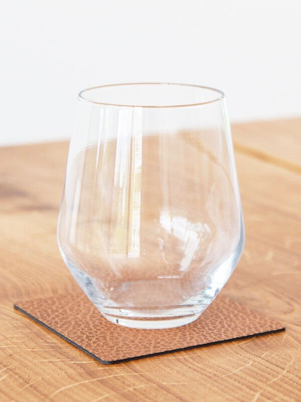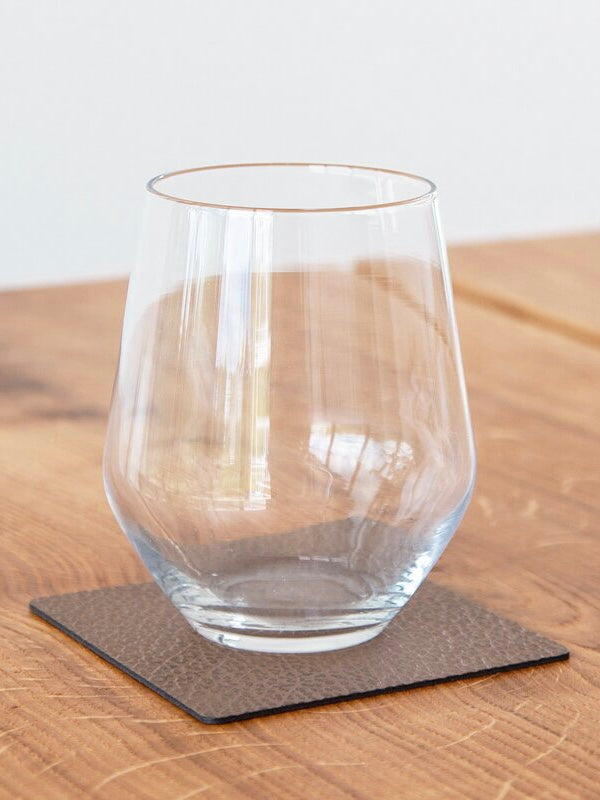 Glasuntersetzer aus recyceltem Öko-Tex Leder und Naturkautschuk. Die Oberfläche ist edel strukturiert und leicht mit einem feuchten Tuch zu reinigen. Klassische quadratische Form.