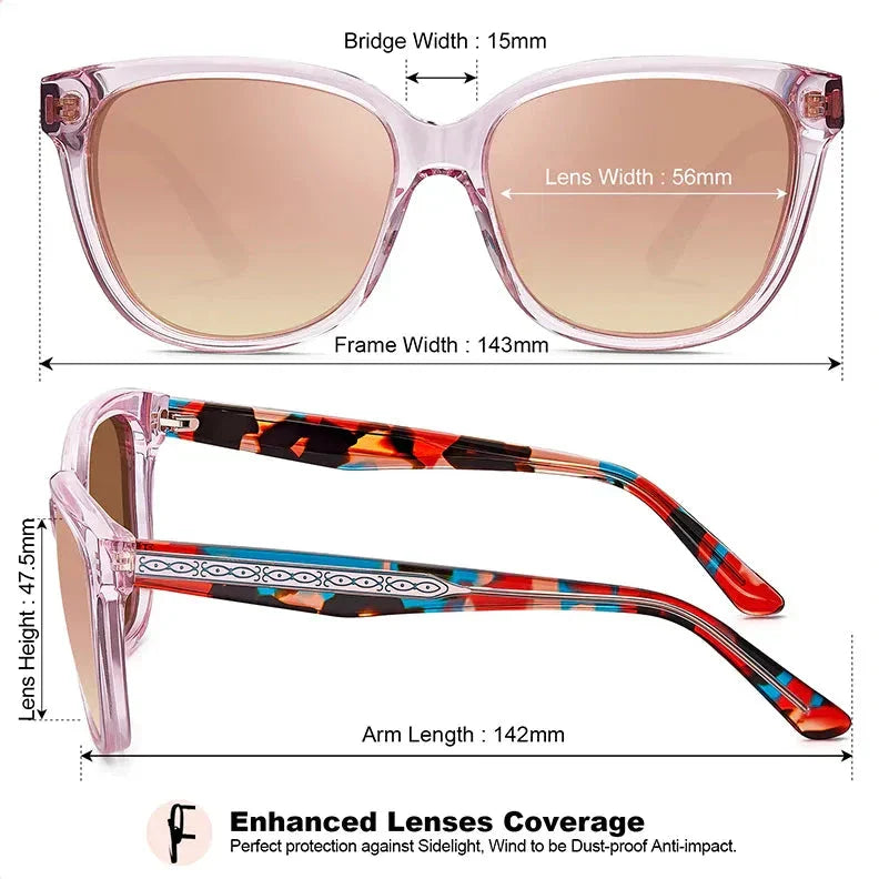 - Women's Sunglasses with Polarized UV Protection - CARFIA polarized sunglasses reduce glare caused by various reflections. Our polarized lenses restore true colors without distorting or deforming the color-saturated image. Additionally, they block 100% of both UVA and UVB radiation. This provides full protection for your eyes, preventing UV damage and effectively filtering the strong sunlight.