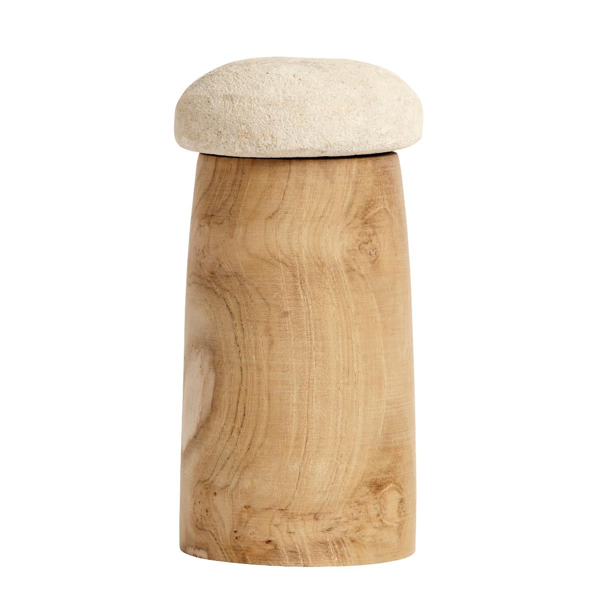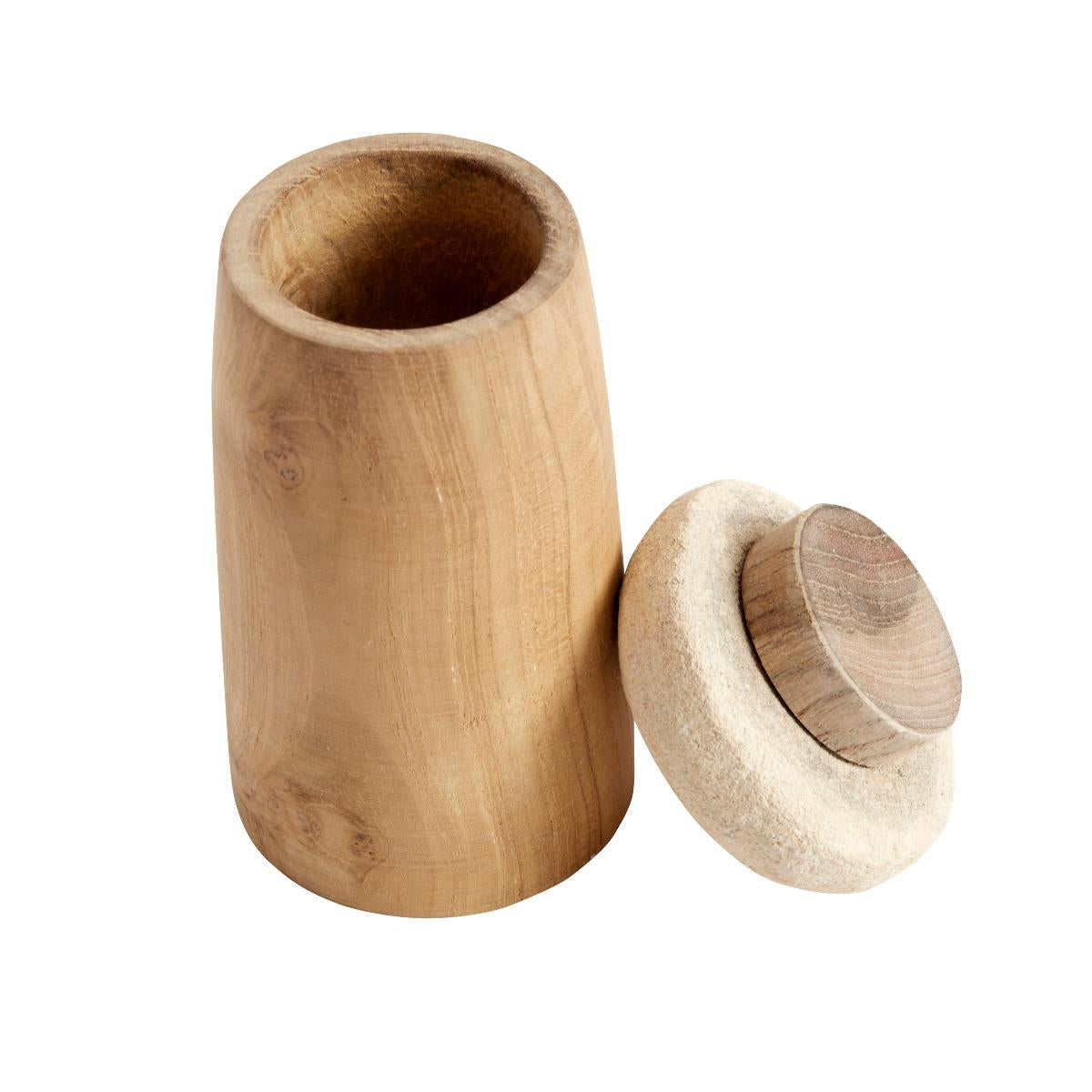 Außergewöhnlich geformte Vorratsdose aus Teakholz mit Deckel aus Sandstein. Zur Aufbewahrung in der Küche, im Bad oder im Wohnbereich.