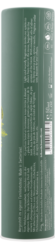 Von Waldwesen verzaubert, verbunden mit der eigenen Mitte. Der lichtvolle, waldige Duft lädt unsere Lebensgeister auf einen Freudentanz ein. Mit ätherischen Ölen von Weißtanne, Zirbelkiefer (Arve), Fichtennadel, Zedernholz, Balsamtanne u.a