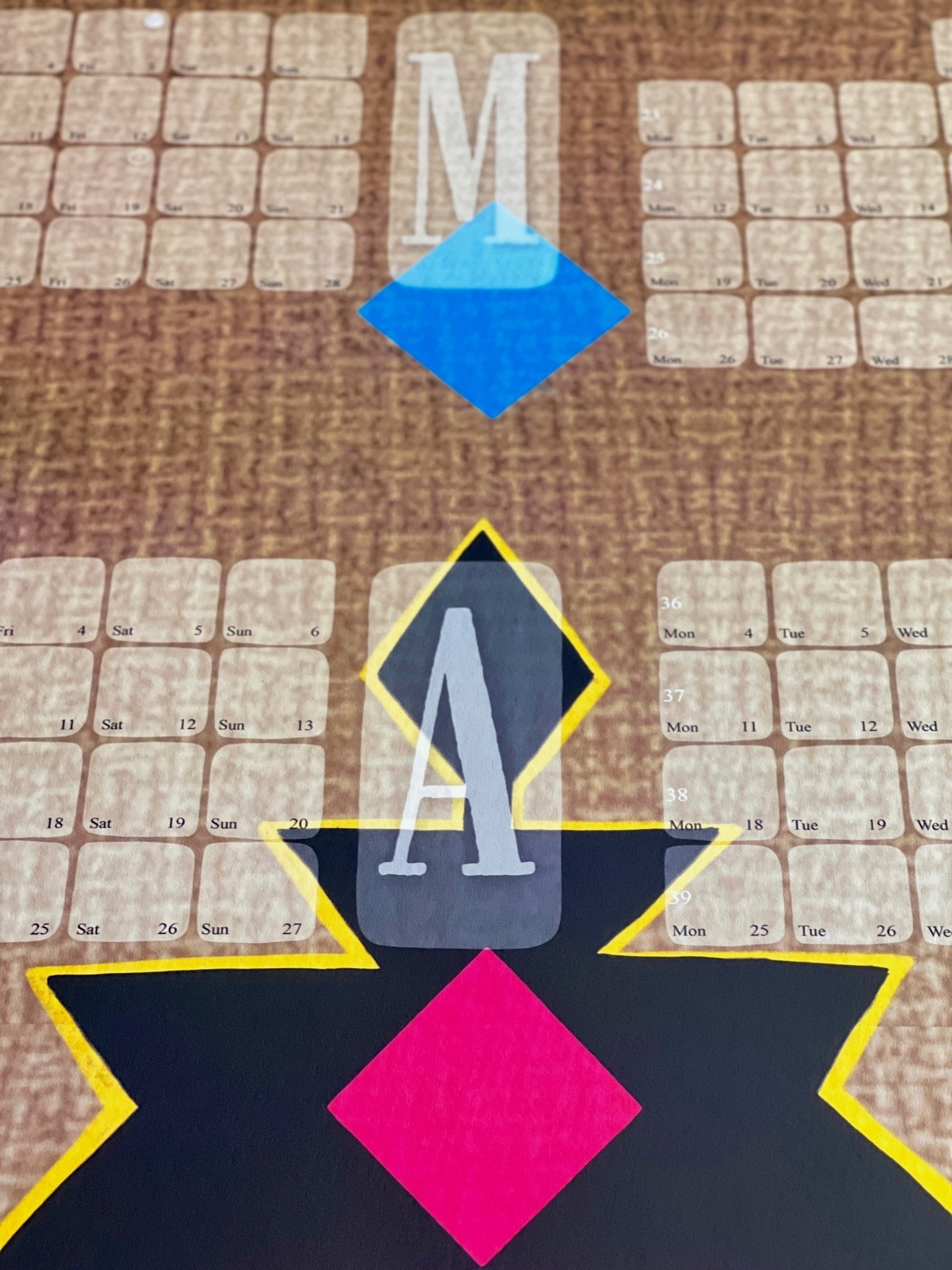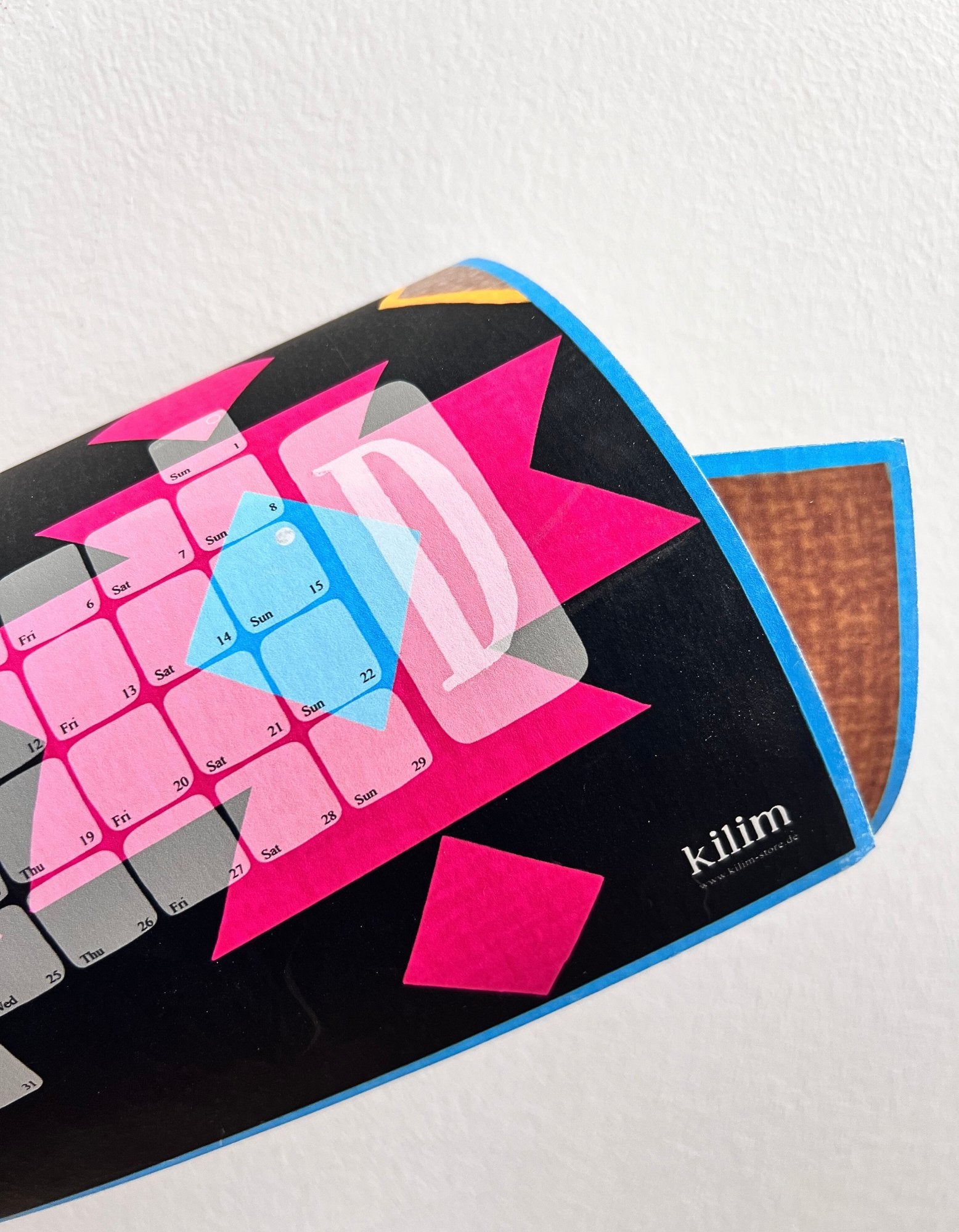Du liebst Kontraste? Dann bist du bei diesem Design-Wandkalender genau richtig: Schwarz mit pinkem Navajo-Muster auf hellbraunem stark gewebten Grund und leuchtenden Akzenten in Neonpink und hellblau.