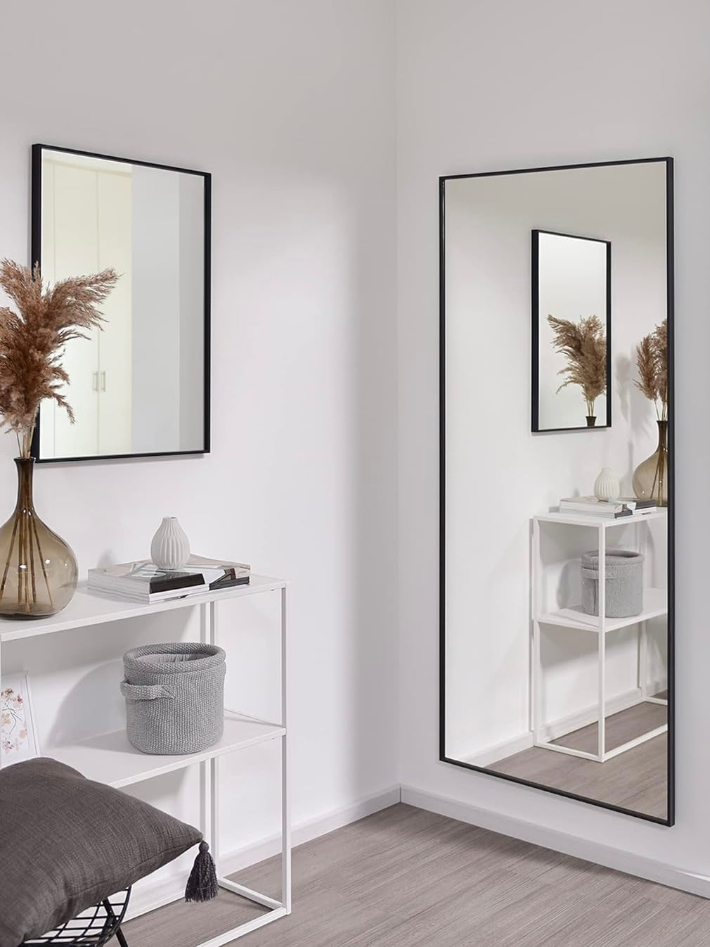 Schlichter Wandspiegel mit rechteckigem Rahmen aus matt schwarz eloxiertem Aluminium. Vielseitig einsetzbar im Flur, Bad oder Schlafzimmer. Minimalistisches Design in hochwertiger Verarbeitung.
