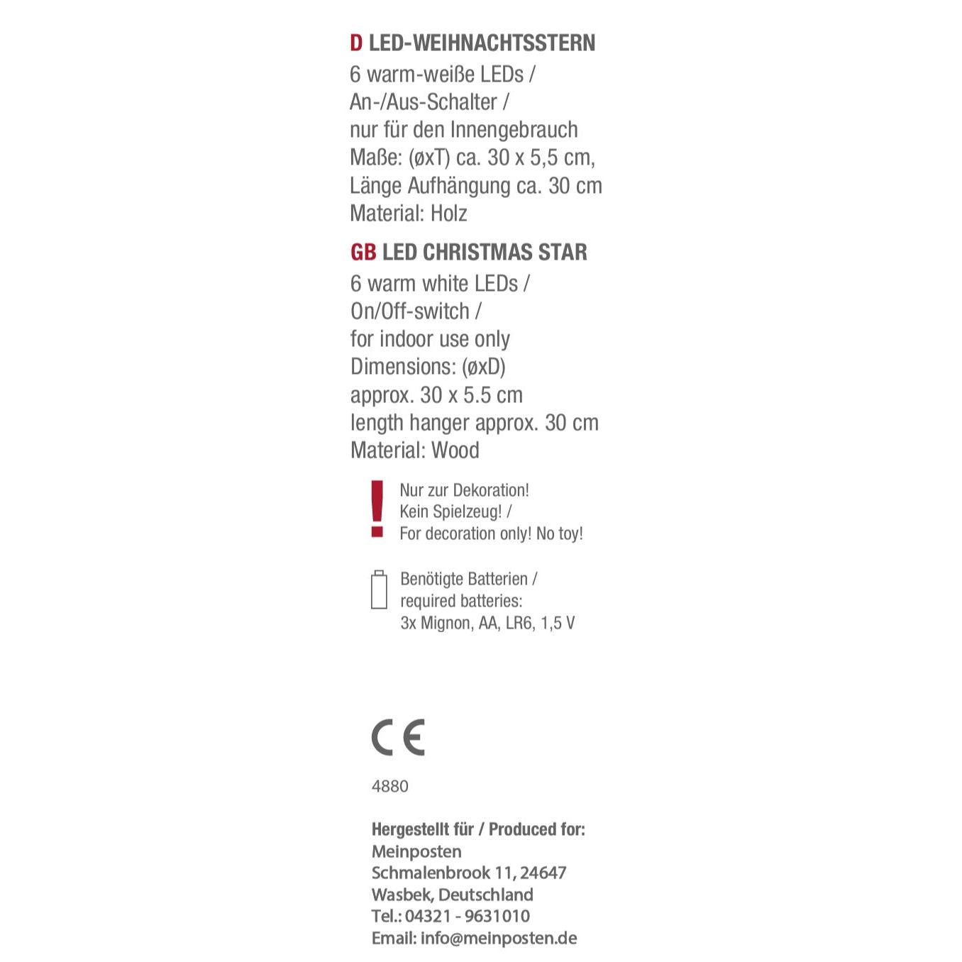 Beleuchteter Stern aus Holz mit 6 warmweißen LEDs & inklusive Batterien.
