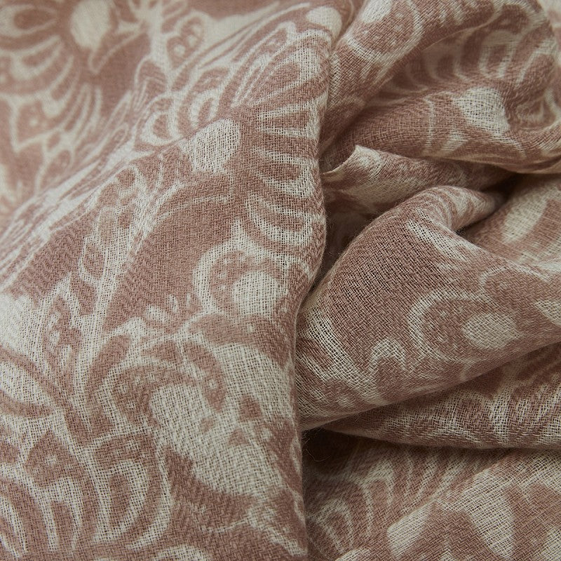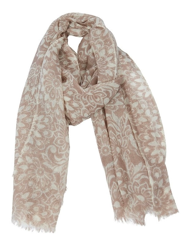 Edler Modeschal mit einem dezenten Floralmuster aus einer hochwertigen Wollqualität. Besonders softes und leichtes Strickgewebe mit kurzen Fransen am Abschluss. Er lässt sich ideal kombinieren.