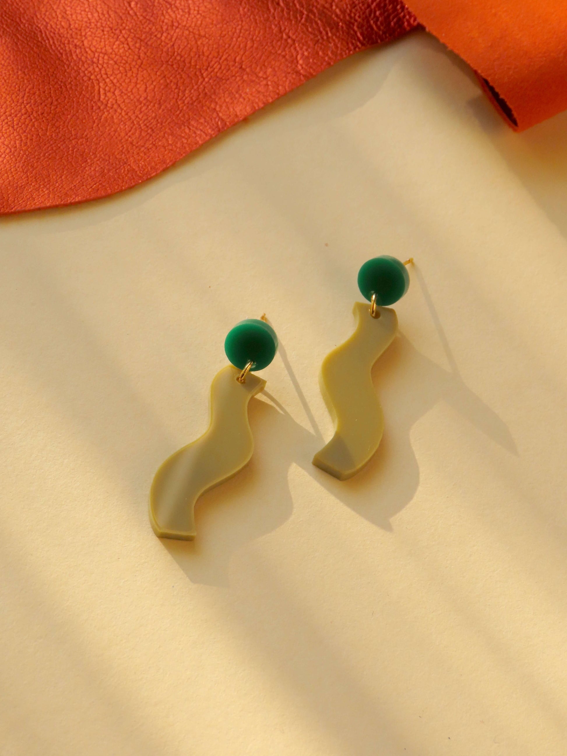 Unsere Wormly Ohrringe zeigen eine weiche, fließende Linienführung – ein verspieltes Wellenmotiv, das Bewegung und Leichtigkeit in dein Outfit bringt. Oben sitzt ein runder Stecker in sattem Grün, daran hängt ein geschwungener Anhänger in warmem Beige, dessen sanft gebogene Form an eine organische Linie erinnert – weich, elegant.