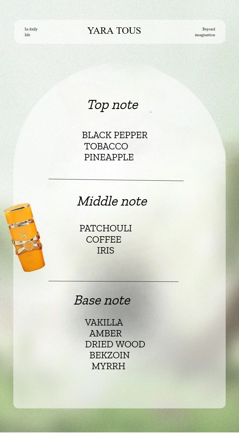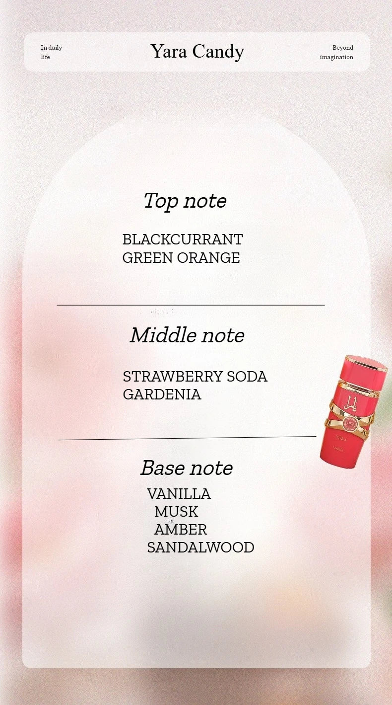 A delicate and feminine fragrance with fragrant notes of flowers and fruits. Ideal for daily outfits, dates, parties, work, or summer occasions, Yara provides a refreshing and enchanting aroma that lingers all day.