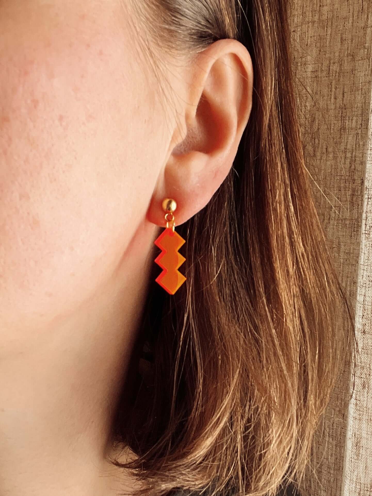Knalliges Neon trifft auf kantiges Design – diese Ohrstecker machen keine halben Sachen.